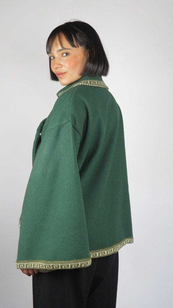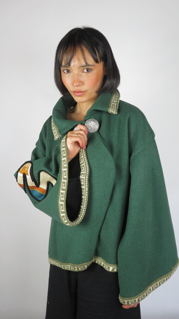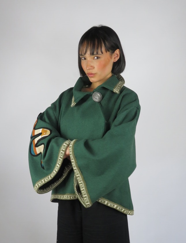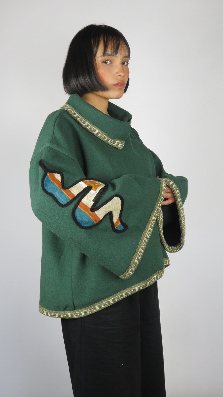 La Capa Medusa es una prenda que habla por sí sola: un diseño en paño verde esmeralda, con mangas campana que le aportan fuerza, fluidez y una personalidad única. En una de sus mangas encontrarás relieves de serpientes tejidos, cada una diferente, como cada persona que la lleva. Su cuello versátil puede usarse alto o cerrado con un broche especial elegido para esta pieza, pensado para mantener la horma impecable gracias a su cierre invisible. Atemporal, elegante y poderosa, esta capa no solo te viste: te envuelve con la fuerza mítica de Medusa y los contrastes de la colección en verde oliva y beige.
