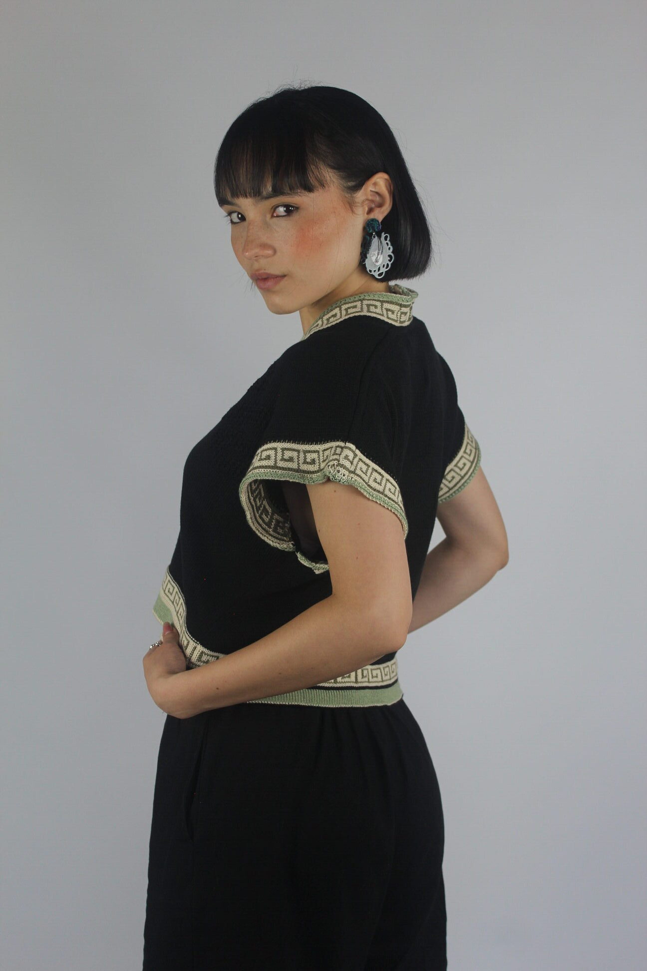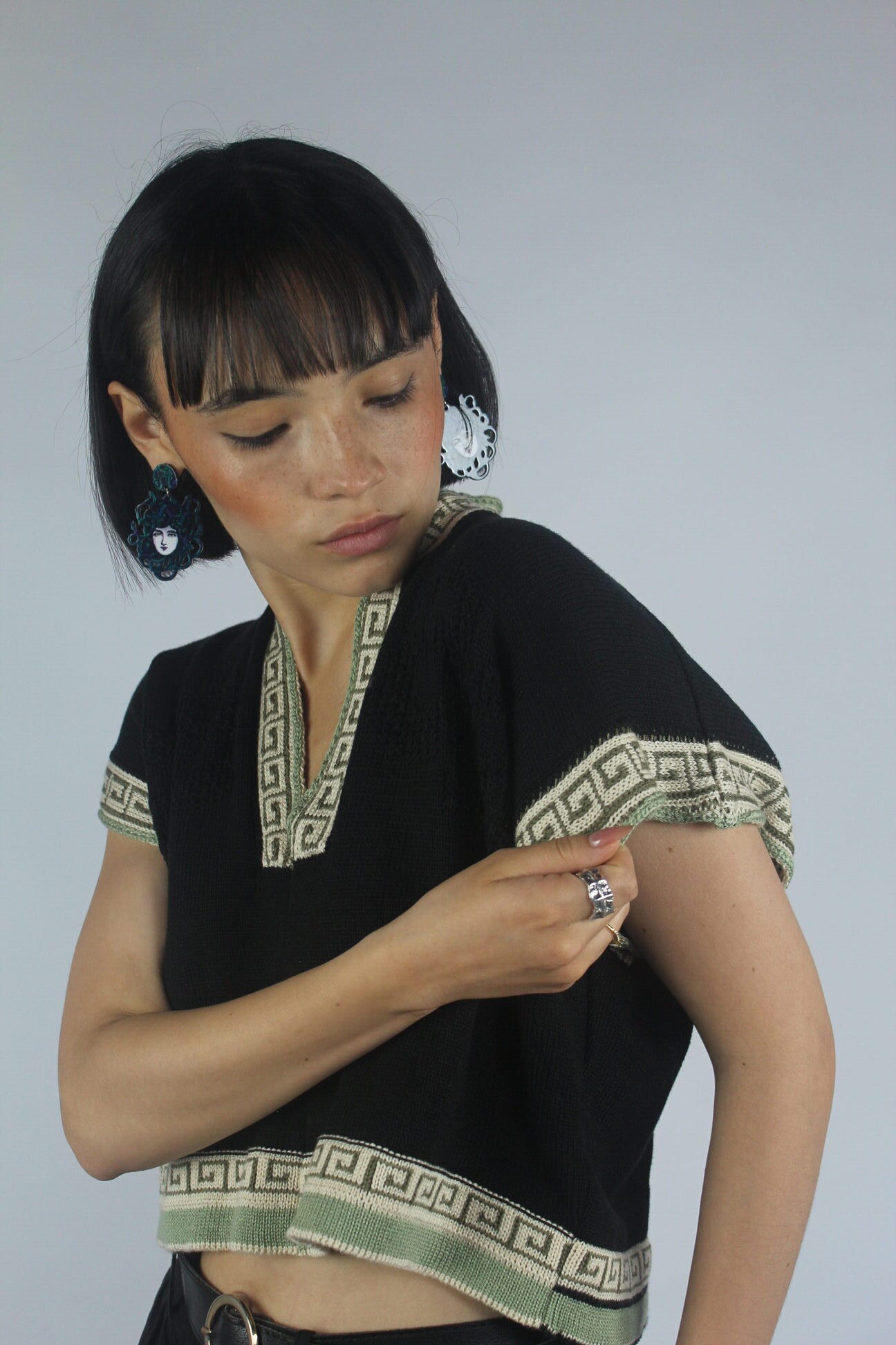El negro profundo se encuentra con acentos en verde oliva y beige, sello de la colección Medusa, creando un contraste versátil que lo hace perfecto para usar tanto en looks casuales como en combinaciones más elevadas.
