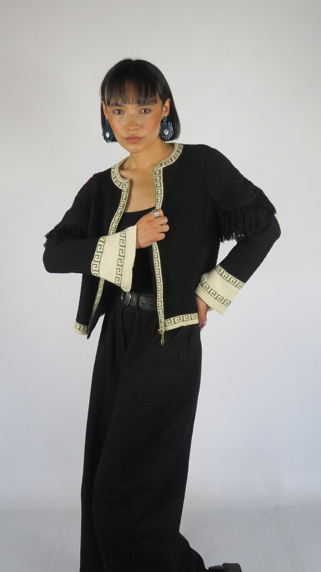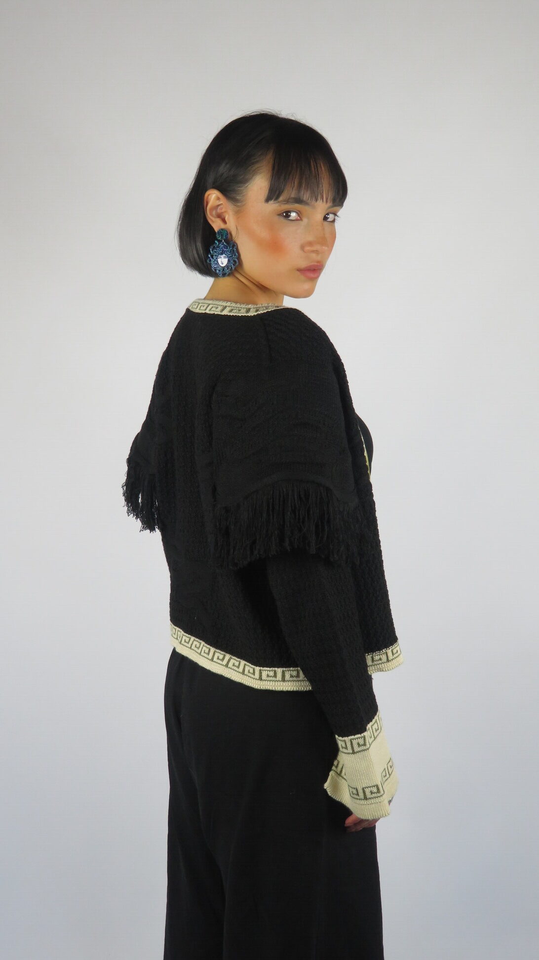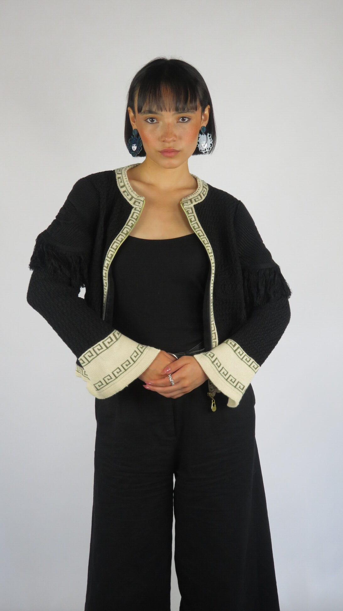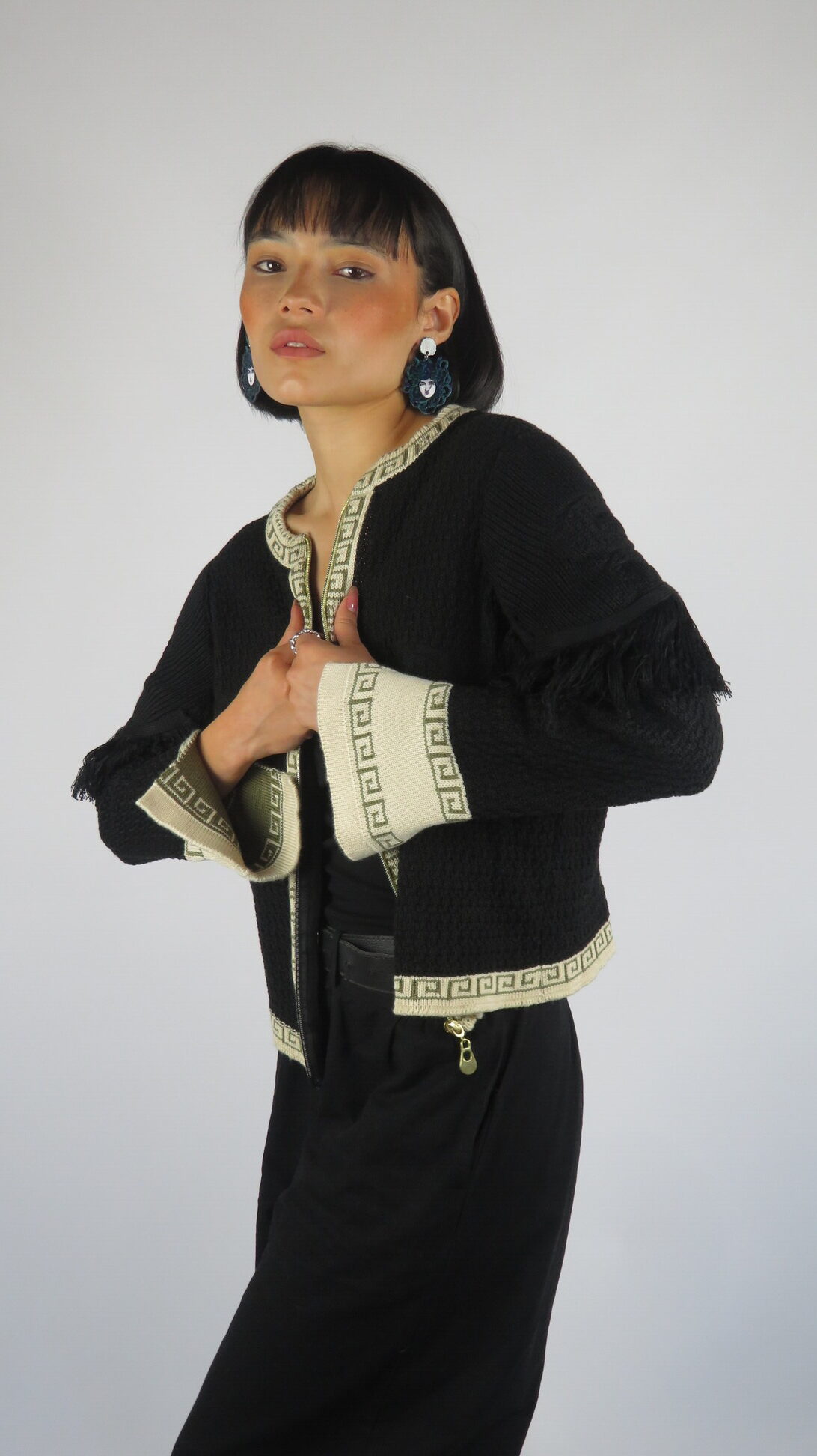 La Chaqueta Medussa está tejida en negro profundo, con relieves de serpientes que elevan el diseño y le dan carácter. Los flecos en los hombros aportan movimiento y fluidez, creando un contraste entre lo imponente y lo sutil. Sus bordes en beige y oliva —colores insignia de la colección— y la cremallera frontal hacen de esta chaqueta una prenda versátil, única y poderosa.