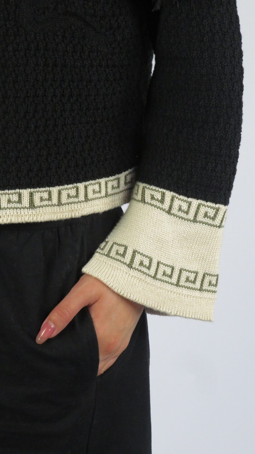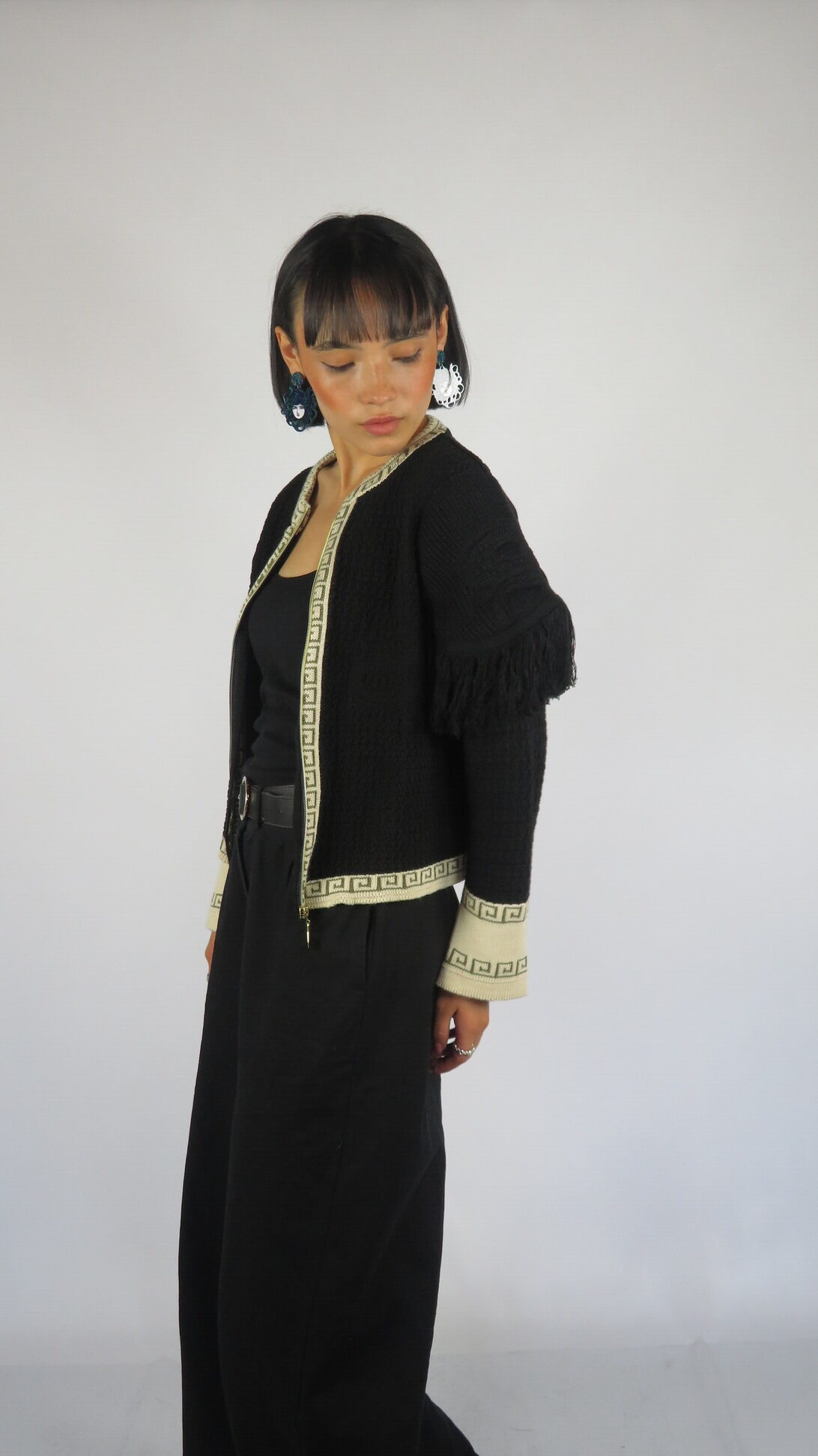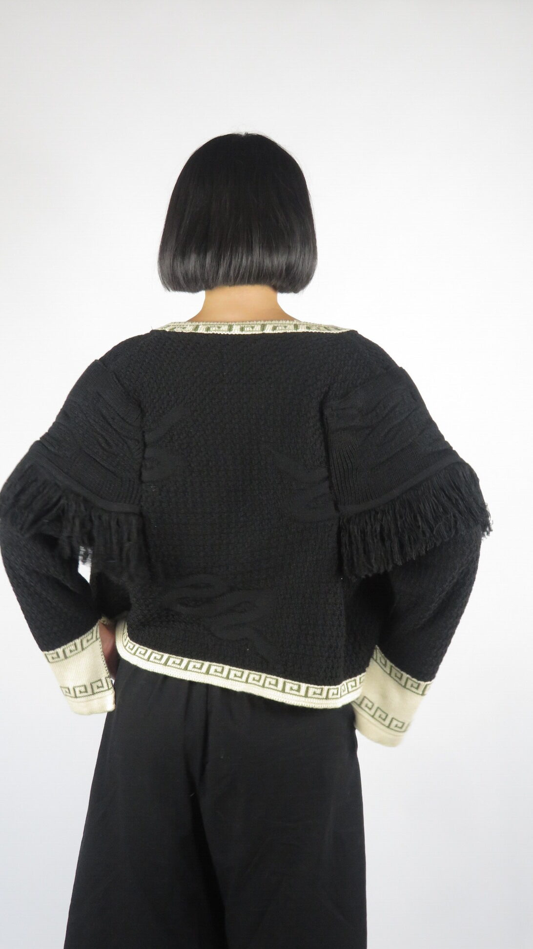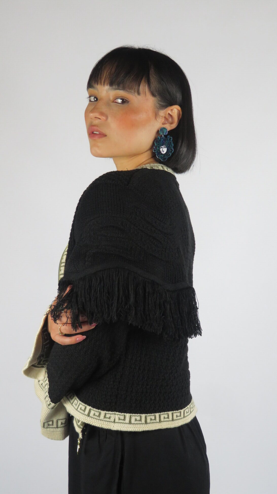 La Chaqueta Medussa está tejida en negro profundo, con relieves de serpientes que elevan el diseño y le dan carácter. Los flecos en los hombros aportan movimiento y fluidez, creando un contraste entre lo imponente y lo sutil. Sus bordes en beige y oliva —colores insignia de la colección— y la cremallera frontal hacen de esta chaqueta una prenda versátil, única y poderosa.